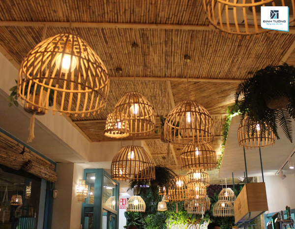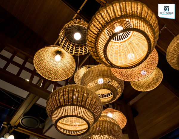 Mẫu trần kết hợp đèn tre nứa thủ công giao thoa nét đẹp hiện đại và truyền thống