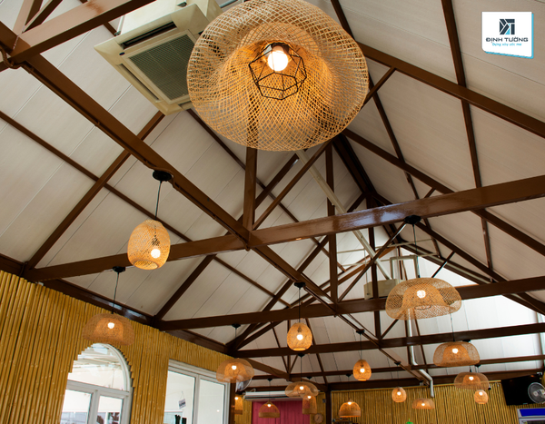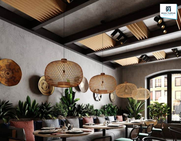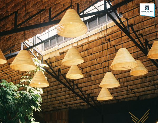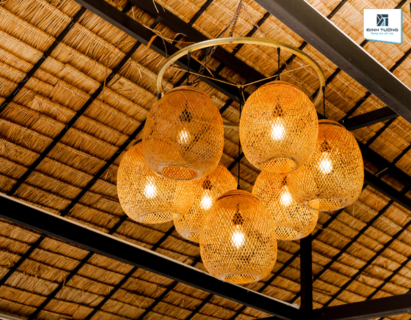 Mẫu trần gỗ kết hợp đèn chùm thủ công từ mây tre tạo nên không gian hoài cổ