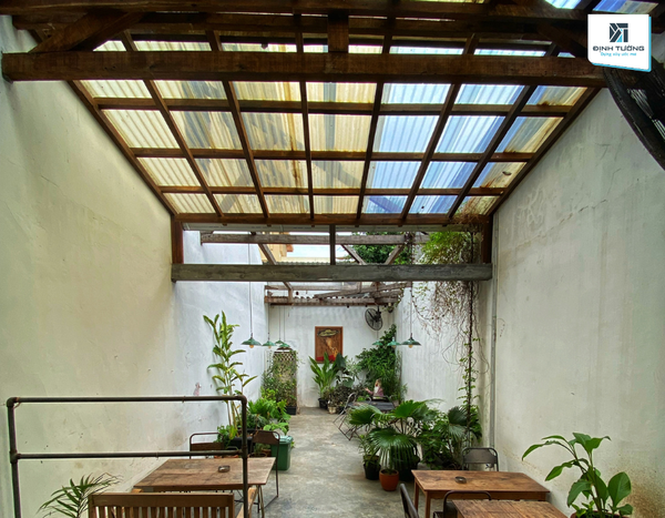 Thiết kế trần quán cà phê kết hợp cây xanh phong cách retro