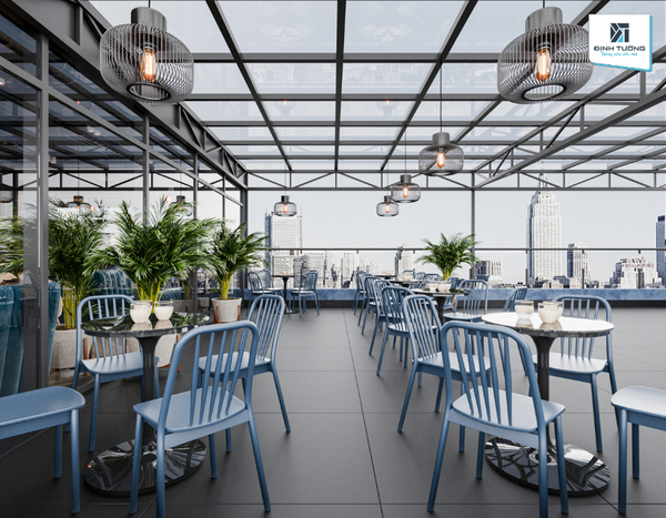 Mẫu trần xuyên sáng trắng mờ cho quán cà phê rooftop hiện đại