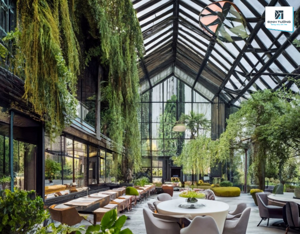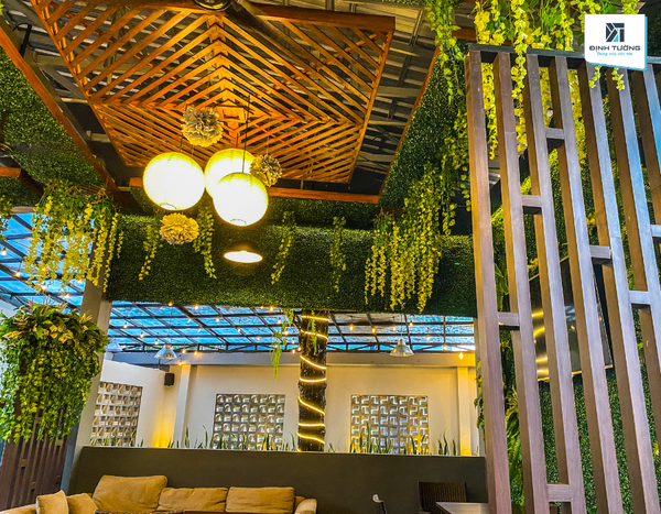 Mẫu trần quán cà phê cao rộng trang trí cây xanh phong cách nhiệt đới phù hợp mọi đối tượng khách hàng