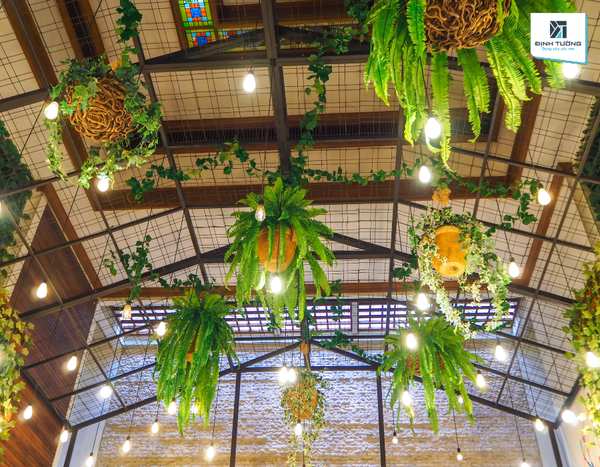 Trần khung thép kết hợp treo những chậu cây xanh đơn giản nhưng tạo điểm nhấn tốt