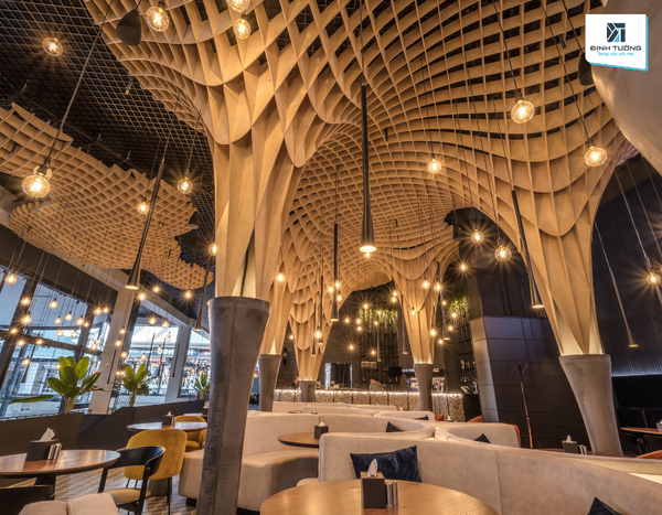 Trần gỗ quán cà phê mang đến vẻ đẹp ấm áp, gần gũi với thiên nhiên. Gỗ tự nhiên như thông, tràm hoặc gỗ công nghiệp đều có thể sử dụng tùy ngân sách. Gỗ có thể được sử dụng dưới dạng lam gỗ, ốp phẳng, hoặc để lộ dầm giả gỗ mang đến sự sang trọng, ấm cúng và đẳng cấp.
