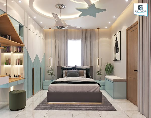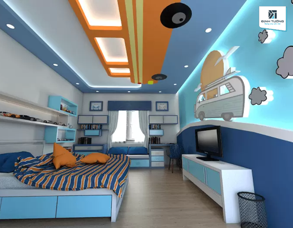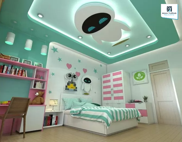 Phòng ngủ trẻ em nên mang lại cảm giác vui tươi, kích thích trí tưởng tượng, nhưng vẫn phải đảm bảo tính nhẹ nhàng để giúp bé ngủ ngon. Có thể sử dụng trần tạo hình 3D hình mây, ngôi sao, mặt trăng hoặc các nhân vật hoạt hình với đèn LED đổi màu sinh động.