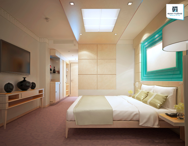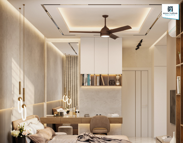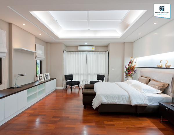 Thiết kế trần phẳng, lõm ở trung tâm tạo điểm nhấn độc đáo cho căn phòng
