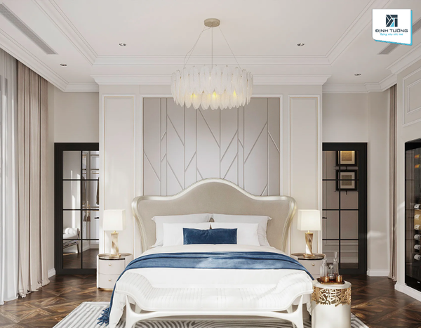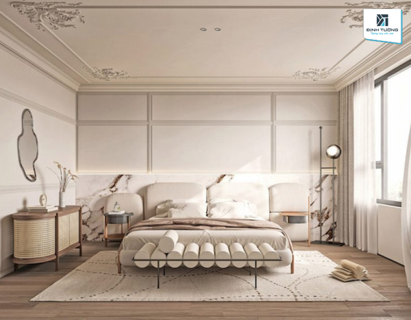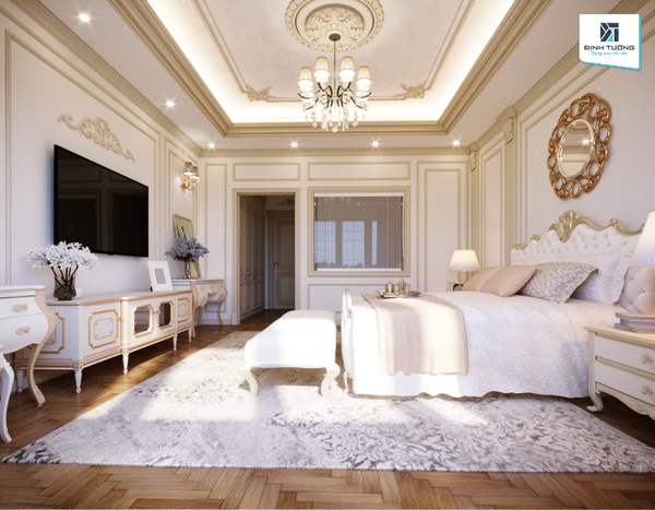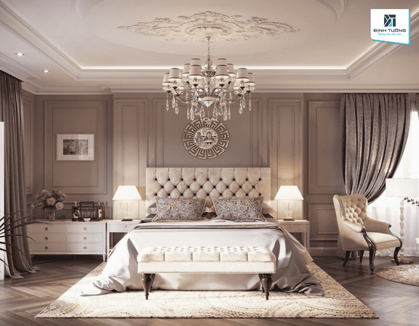 Phong cách tân cổ điển nhưng đã được tinh giản để tạo sự thư giãn cần thiết cho phòng ngủ, mang lại cảm giác quý phái, sang trọng nhưng vẫn tinh tế. Thiết kế này thường là trần giật cấp nhẹ, có phào chỉ hoặc hoa văn tinh xảo, màu sắc chủ đạo là kem, trắng sáng, vàng nhạt kết hợp đèn chùm pha lê nhỏ, ánh sáng vàng ấm. Tuy nhiên, hãy chú ý không nên thiết kế quá rườm rà chỉ cần một điểm nhấn ở giữa trần hoặc viền bo mềm mại là đủ tạo cảm giác cao cấp, sang trọng.