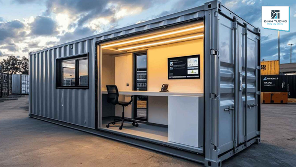 Container văn phòng được cải tạo từ thùng container hàng hóa ISO 20 feet (6m) hoặc 40 feet (12m). Kết cấu thép cực kỳ chắc chắn, chịu được tải trọng lớn. Container 20 feet có diện tích sử dụng khoảng 13-15m², phù hợp cho 3-5 nhân viên làm việc. Container 40 feet rộng hơn gấp đôi, có thể bố trí 8-10 vị trí làm việc. Có thể xếp chồng tối đa 3 tầng để tạo không gian đa tầng. Các dự án văn phòng startup thường sử dụng giải pháp này để tạo nên kiến trúc độc đáo.