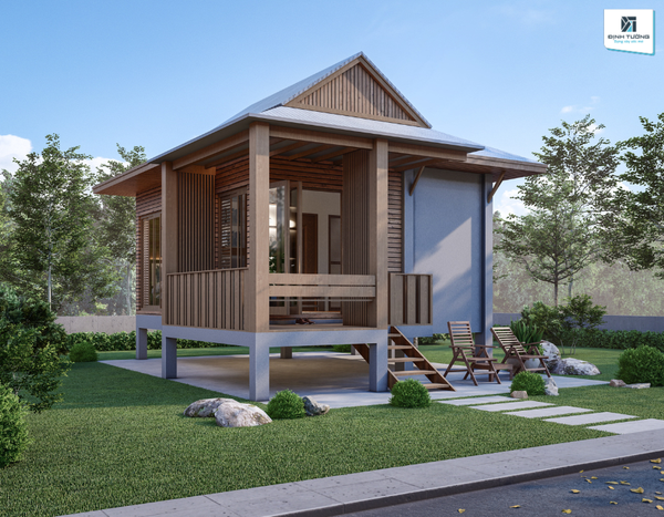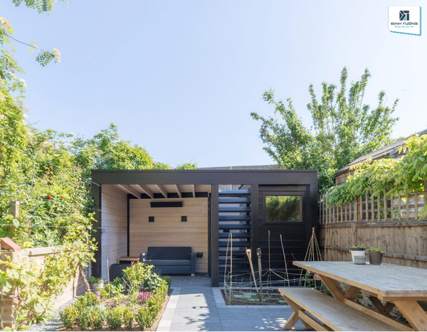 Nhà tiền chế nhà vườn là lựa chọn được ưa chuộng ở nông thôn hoặc vùng ven đô thị. Công trình hòa mình với thiên nhiên, thiết kế mở, sử dụng vật liệu giả gỗ, kính và tấm ốp Nano tạo cảm giác ấm cúng, thư thái.
