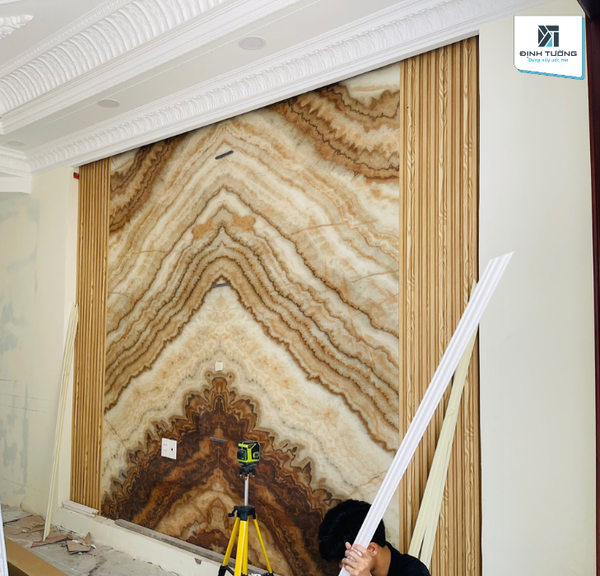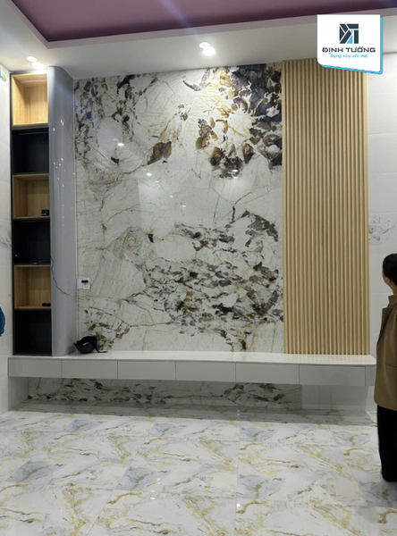 Tấm ốp tường Nano vân đá marble trắng làm điểm nhấn cho phòng khách