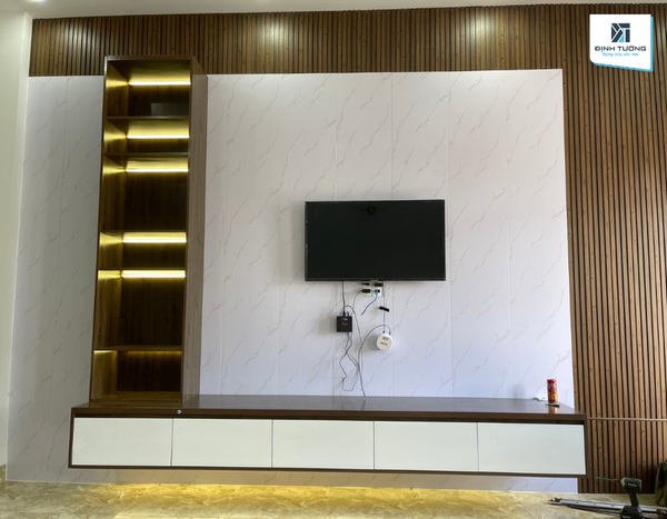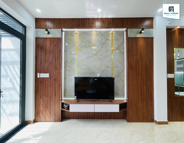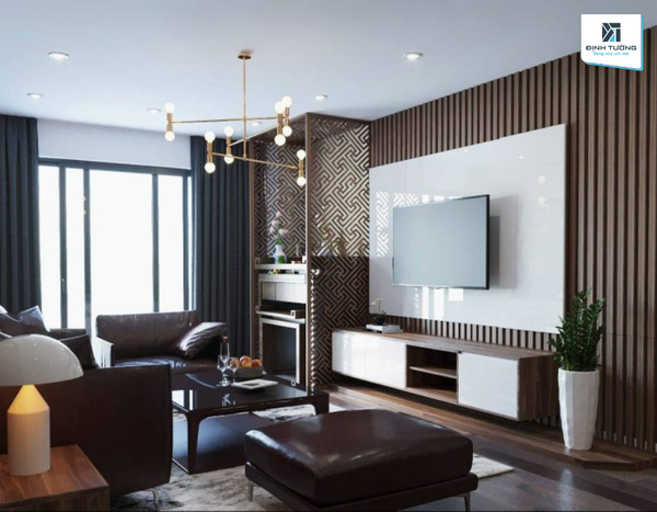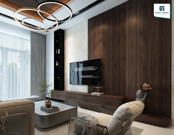 Ốp toàn bộ tường phía sau tivi bằng tấm nhựa vân gỗ tối màu hiện đại kết hợp nội thất đẳng cấp