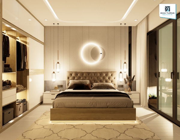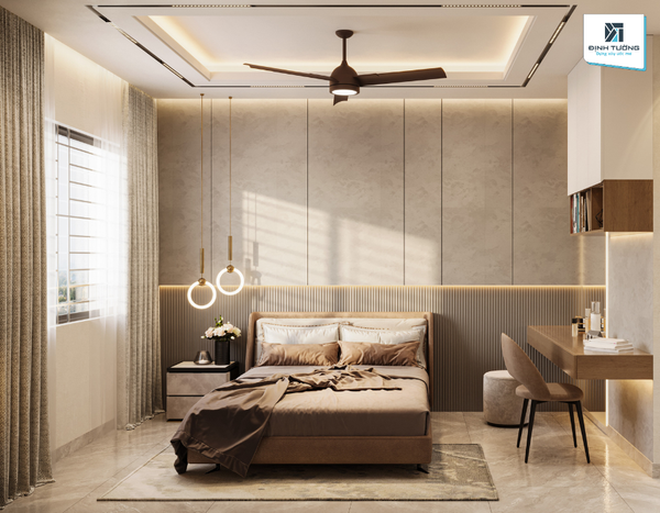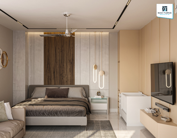 Mẫu phòng ngủ ốp nhựa gam màu nâu kem nhạt đẳng cấp