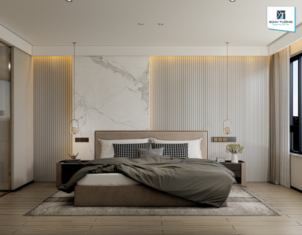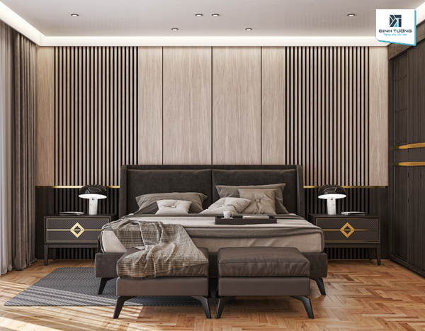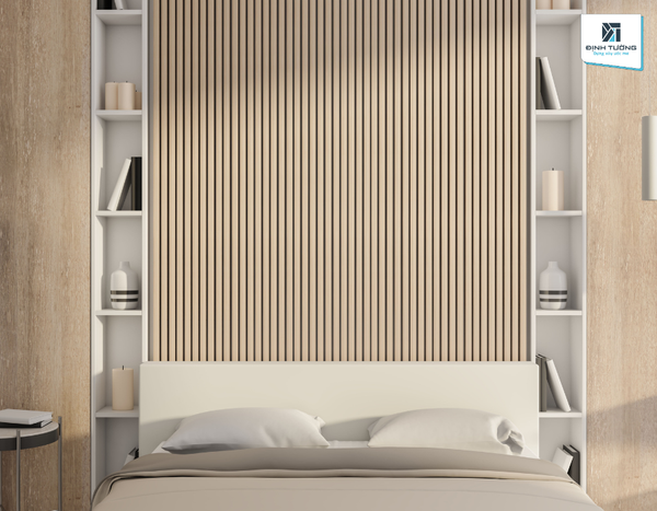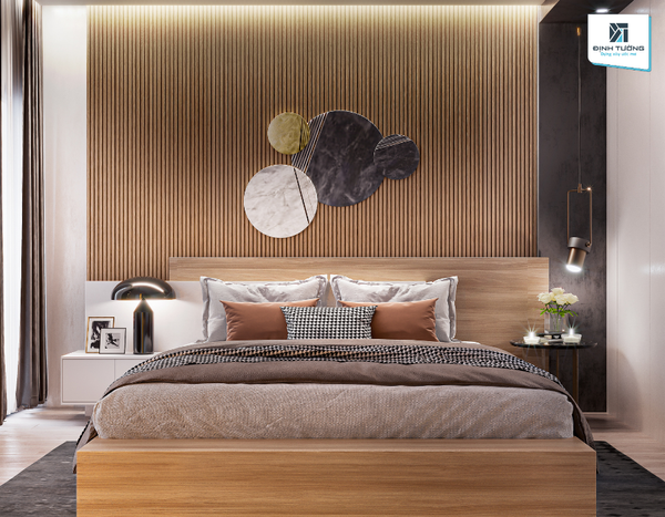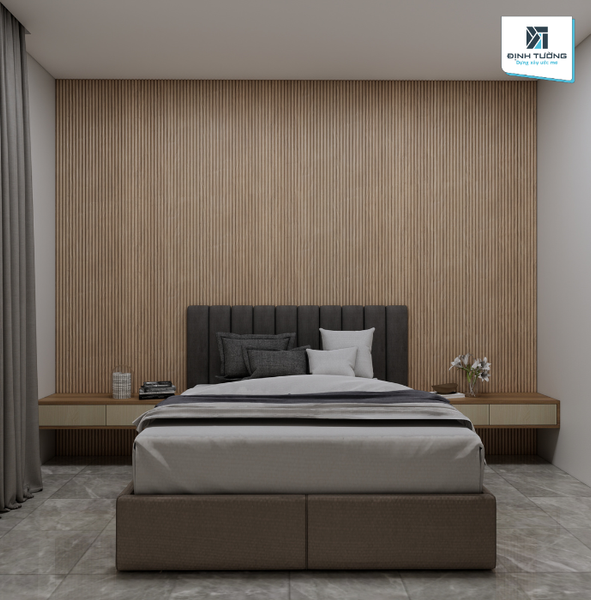 Thiết kế tường đầu giường với tấm ốp Nano vân gỗ màu trung tính mang đến cảm giác thư giãn