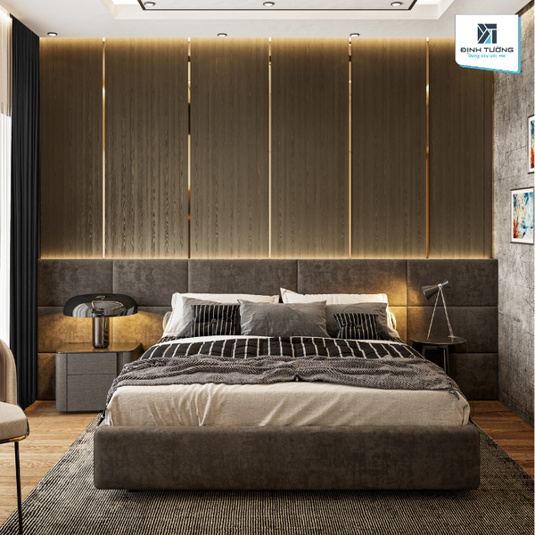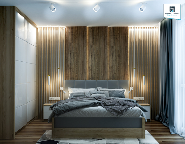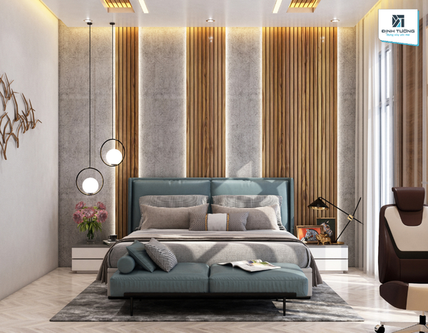 Sử dụng tấm ốp màu xi măng nhạt cùng thanh lam vân gỗ trên đầu giường mang đến phòng ngủ ấn tượng