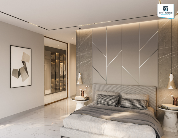 Mẫu phòng ngủ sử dụng tấm ốp nhựa Nano màu xám hiện đại