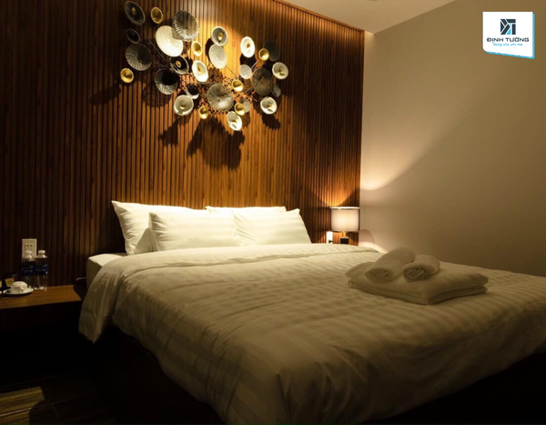 Ốp tấm nhựa thẳng từ sàn lên kịch trần phía đầu giường tạo cảm giác không gian cao, thoáng đãng