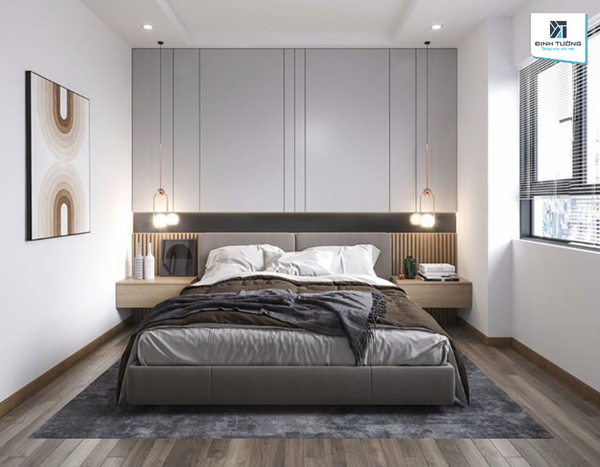 Thiết kế tường đầu giường với tấm ốp Nano vân gỗ màu trung tính (màu sồi, óc chó nhạt) ốp toàn bộ tường đầu giường. Tạo cảm giác không gian cao, thoáng đãng và ấm áp. Ốp tường màu trơn đơn giản như trắng, kem, xám nhạt,... đơn giản nhưng tinh tế, dễ kết hợp với mọi phong cách nội thất.