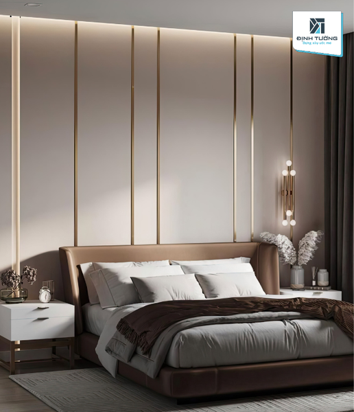 Tấm ốp PVC màu nâu nhạt trang trí đầu giường tạo cảm giác nhẹ nhàng, thư giãn