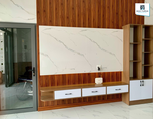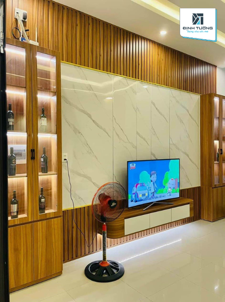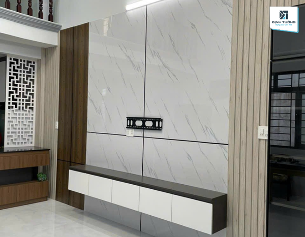 Gia chủ có thể chọn ốp một phần tường phía sau tivi để tạo điểm nhấn, làm nổi bật khu vực này. Sử dụng tấm ốp Nano vân đá marble trắng xám hoặc trắng vàng để ốp toàn bộ mảng tường sau TV. Sự bóng bẩy, sang trọng của vân đá tạo chiều sâu và cảm giác không gian rộng hơn.