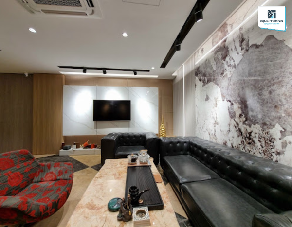 Thiết kế phòng khách ấn tượng với tường nhựa vân đá