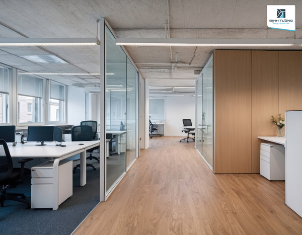 - Vách ngăn kính trong suốt/kính mờ: Kính trong suốt hoặc kính có họa tiết mờ nhẹ kết hợp với khung gỗ hoặc kim loại mảnh, giúp ánh sáng lọt qua, vẫn đảm bảo riêng tư và cách âm.