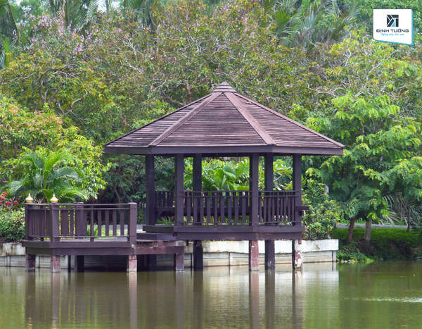 Nhà chòi sân vườn sử dụng gỗ tự nhiên và mái ngói làm vật liệu chính